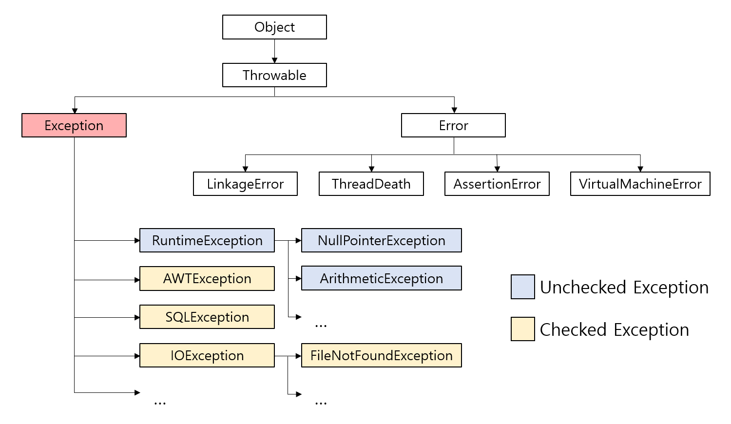throws : 예외 발생 시 자신을 호출한 상위 메소드로 예외를 던짐(특정 상위 메소드에서 예외를 한 번에 처리하는 경우가 있을 수 있음, 계속 throws로 던질 경우 최종적으로 JVM이 처리를 하게 되지만, 권장하지 않음)