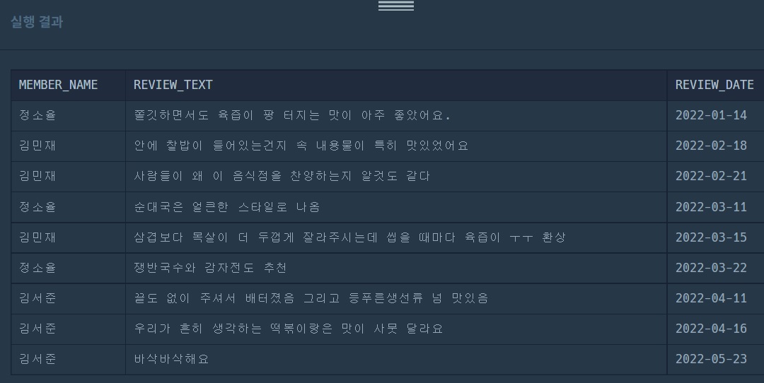| [SQL] 프로그래머스 [Level-4] 서울에 위치한 식당 목록 출력하기 (0) | 2022.12.02 |