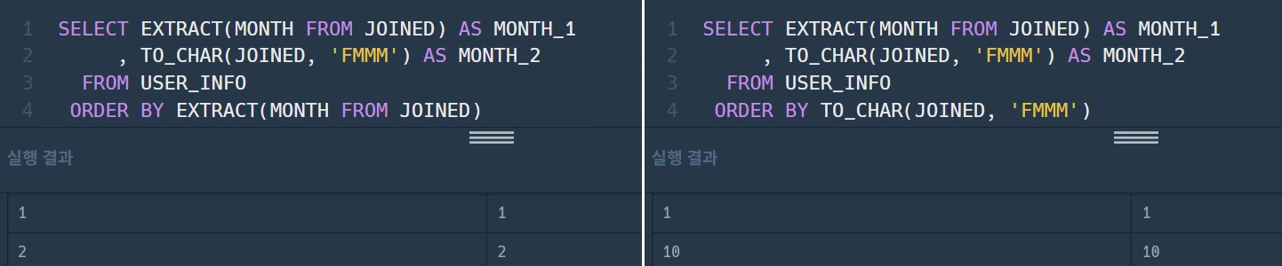 Oracle에서 EXTRACT(MONTH FROM 날짜), TO_CHAR(날짜, 'FMMM') 차이