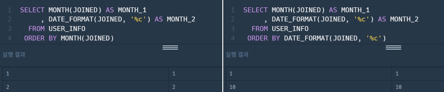 MySQL에서 MONTH(날짜), DATE_FORMAT(날짜, '%c') 차이