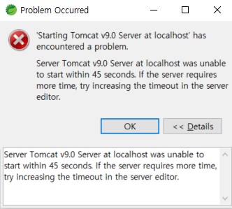 서버의 구동 시간이 톰캣의 기본 설정 시간제한인 45초보다 길어서 발생한 오류이다.