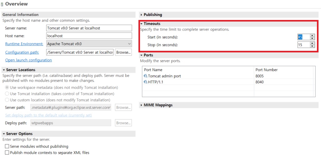 2. Tomcat 서버 Overview에서 Timeouts 메뉴 찾아서 펼치기