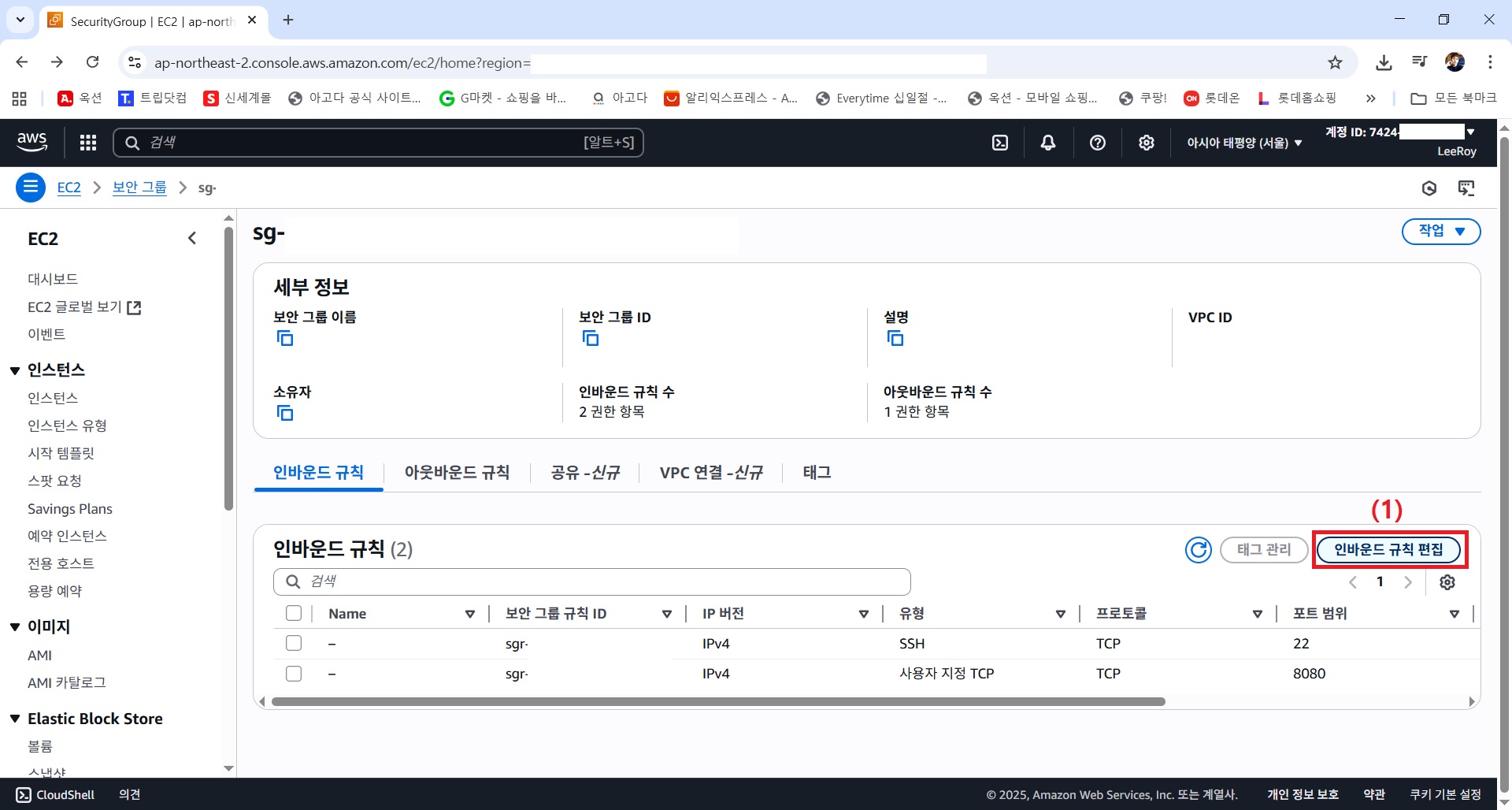 10) 인바운드 규칙 편집을 위해 보안 그룹 클릭