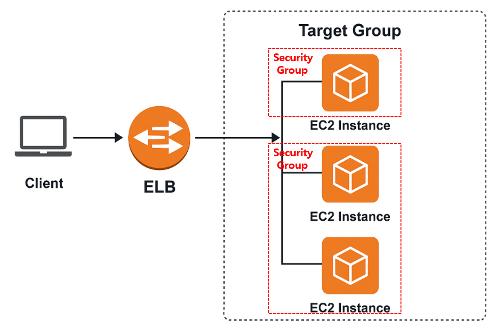 Client → ELB → Target Group → (Security Group → EC2) → ELB → Client