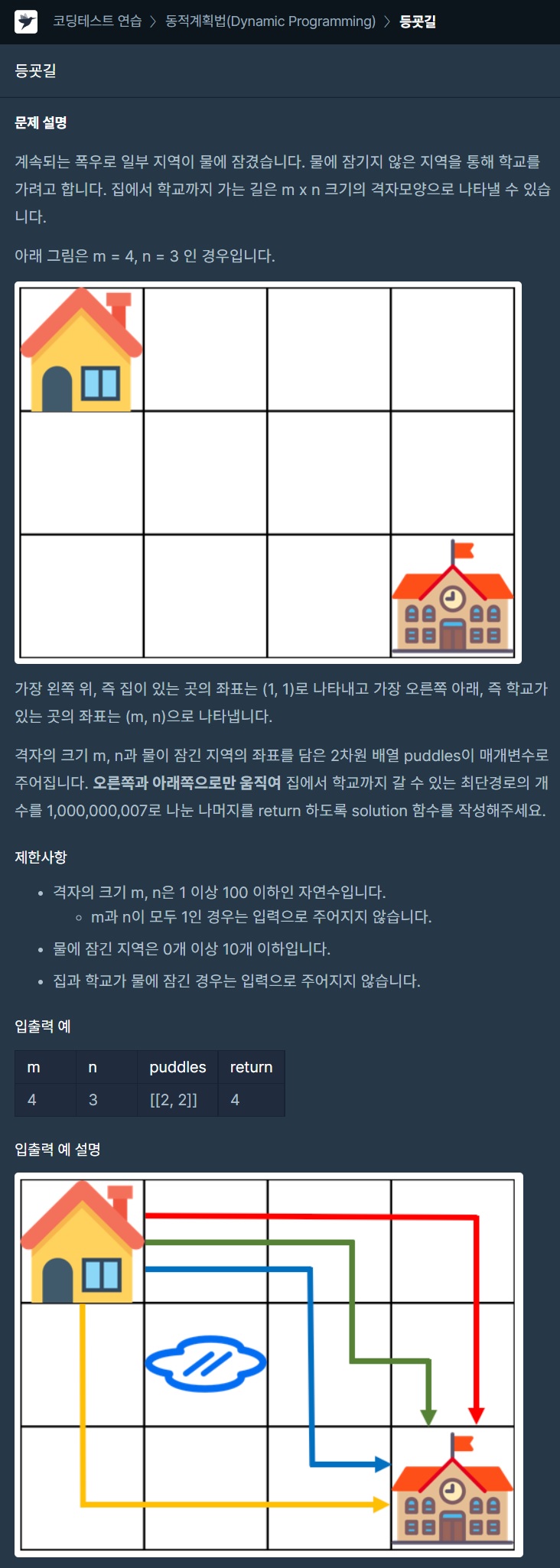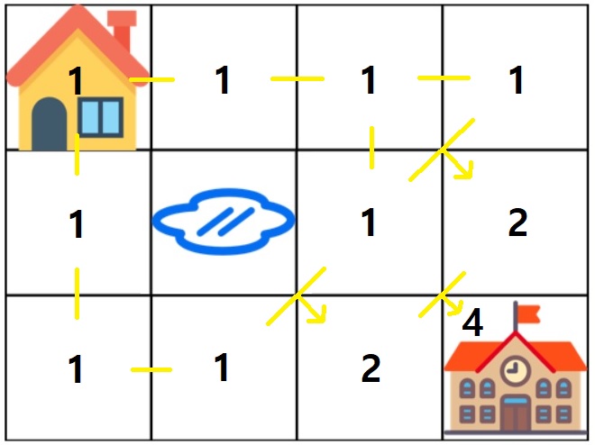 int[][] puddles = {{2, 2}}; // 웅덩이 좌표 // 열, 행