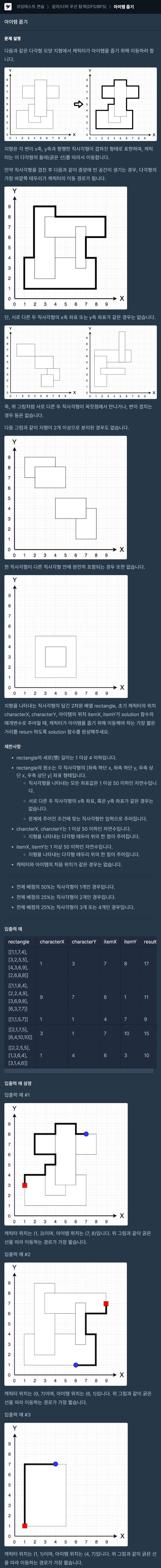 System.out.println(solution(rectangle, characterX, characterY, itemX, itemY));