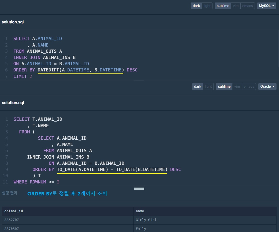 ORDER BY TO_DATE(A.DATETIME) - TO_DATE(B.DATETIME) DESC