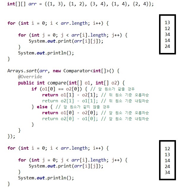 return o1[0] - o2[0]; // 앞 원소 기준 오름차순