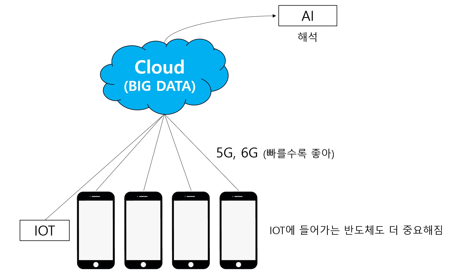 스마트폰, 사물 인터넷의 정보를 빠르게 클라우드로 보냄 => AI가 빅데이터를 분석 후 새로운 정보를 줌