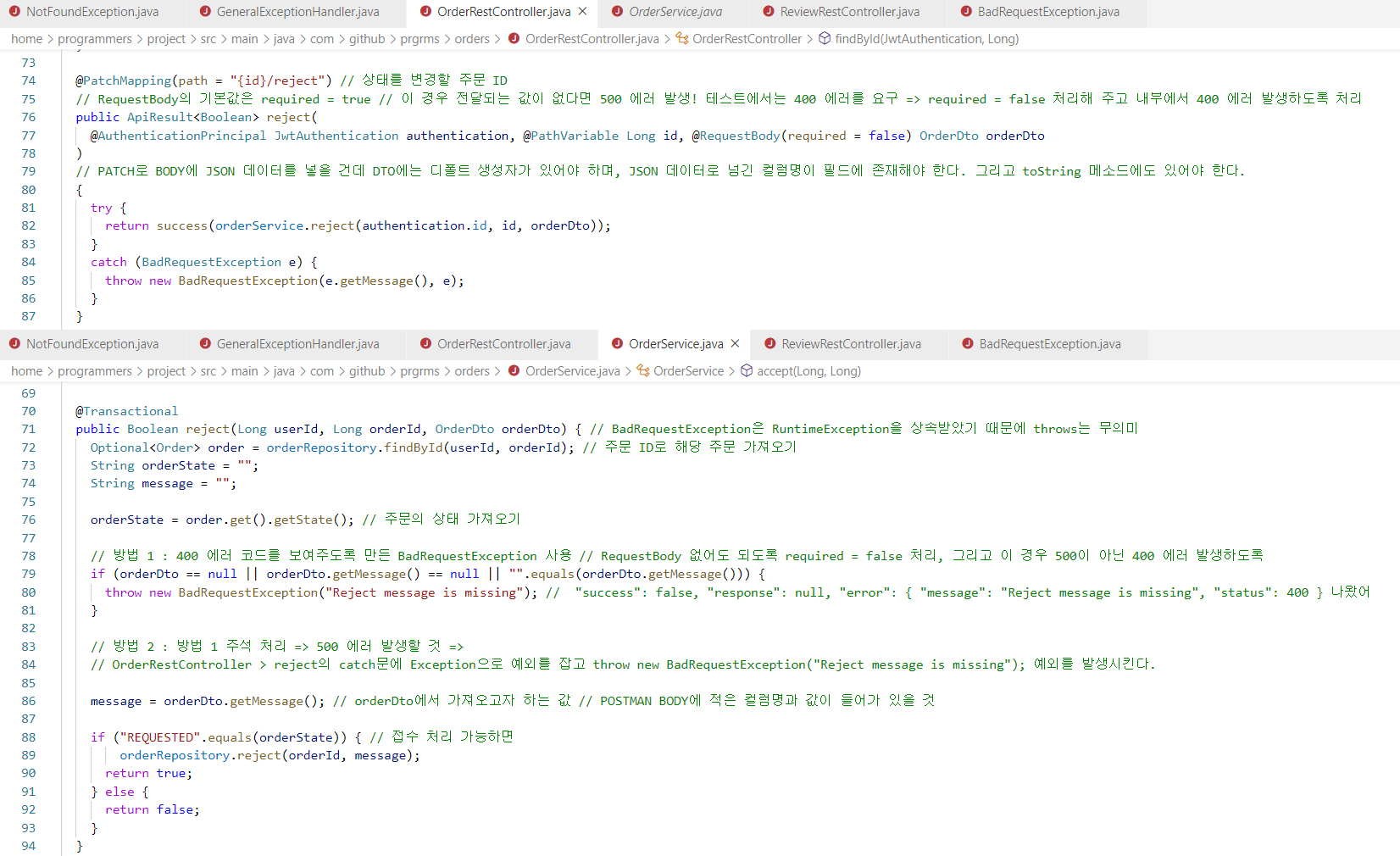 throw : 강제로 예외를 발생시킬 수 있음 단, 발생시킨 예외를 catch문에서 잡을 수 있는 처리가 되어있지 않으면 오류 발생(catch문의 Exception은 모든 예외를 잡을 수 있음)