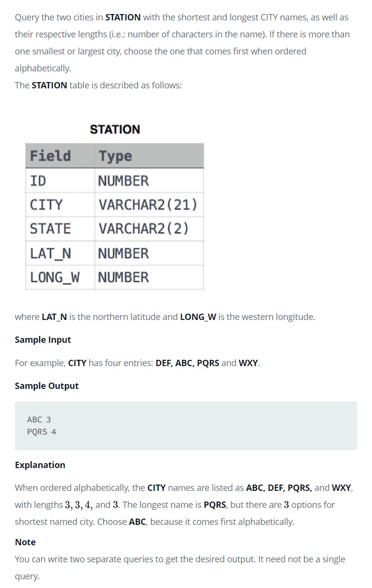 WHERE LENGTH(CITY) = (SELECT MIN(LENGTH(CITY)) FROM STATION)