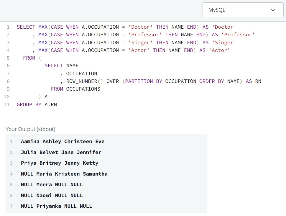 , MAX(CASE WHEN A.OCCUPATION = 'Professor' THEN NAME END) AS 'Professor'