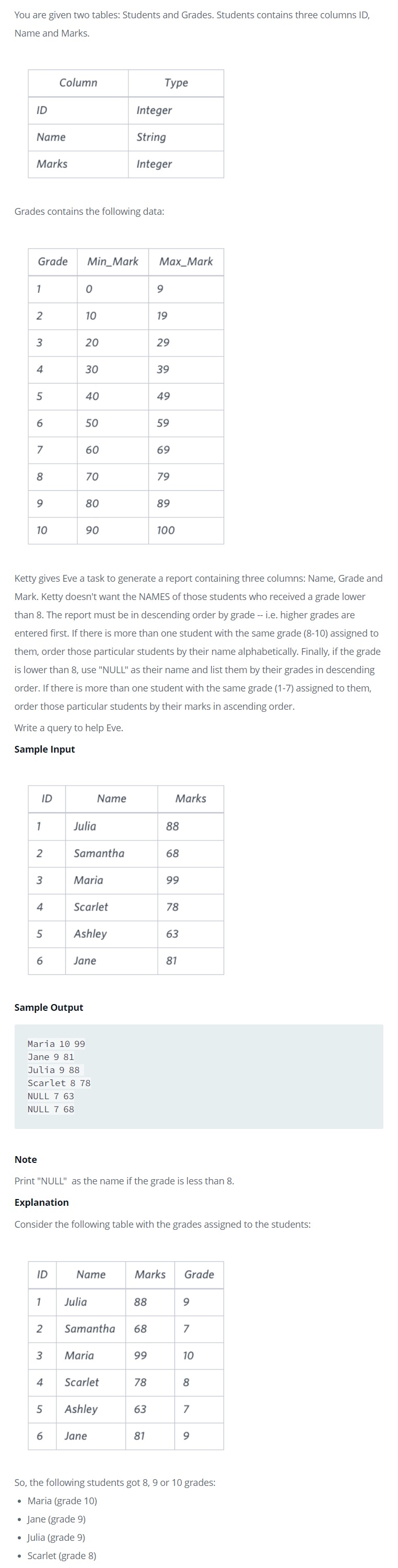 ORDER BY B.GRADE DESC, NAME, A.MARKS