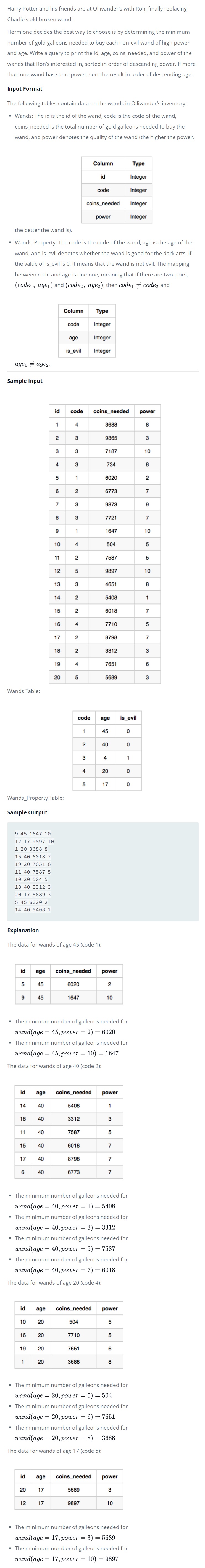 FROM (SELECT CODE, MIN(COINS_NEEDED) AS MIN_COINS_NEEDED, POWER FROM WANDS GROUP BY CODE, POWER) A