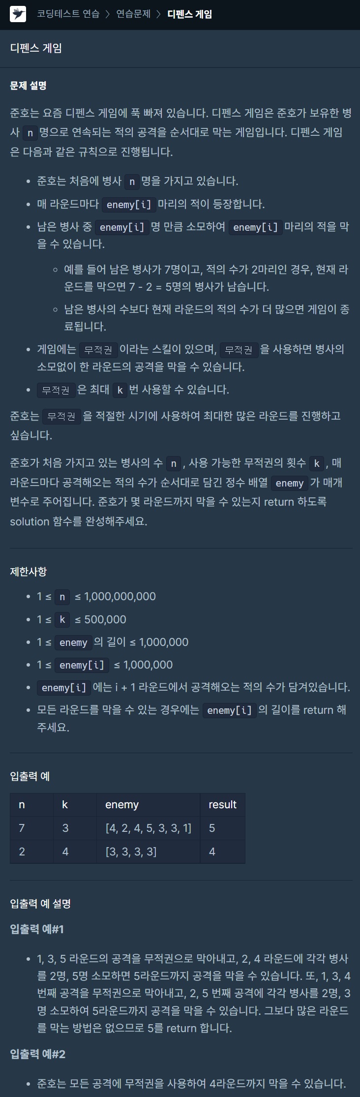 프로그래머스 디펜스 게임 문제 풀이 Java