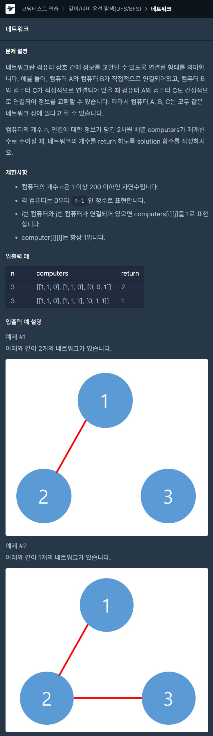 int[][] computers = {{1, 1, 0}, {1, 1, 0}, {0, 0, 1}}; // 연결된 네트워크