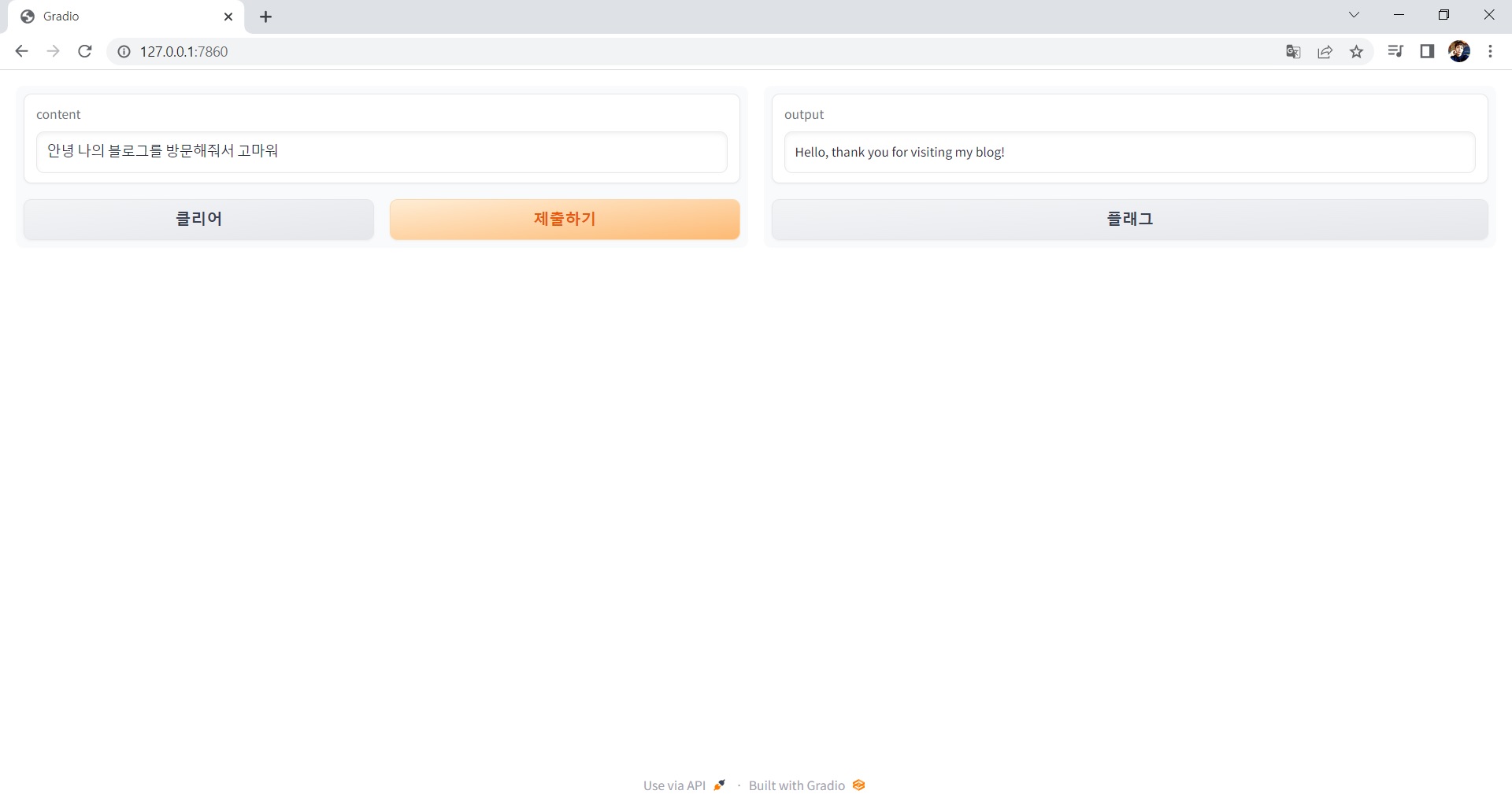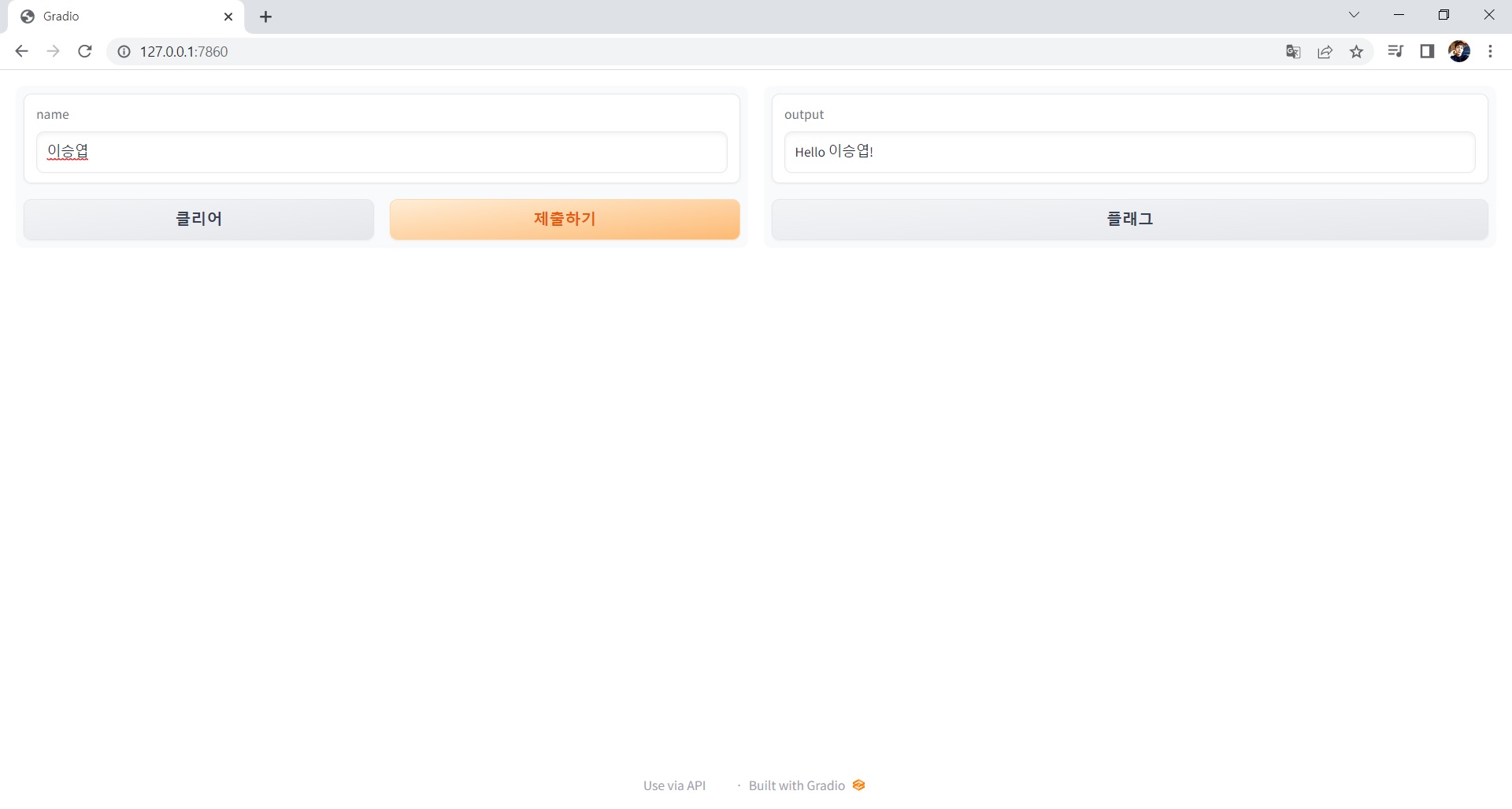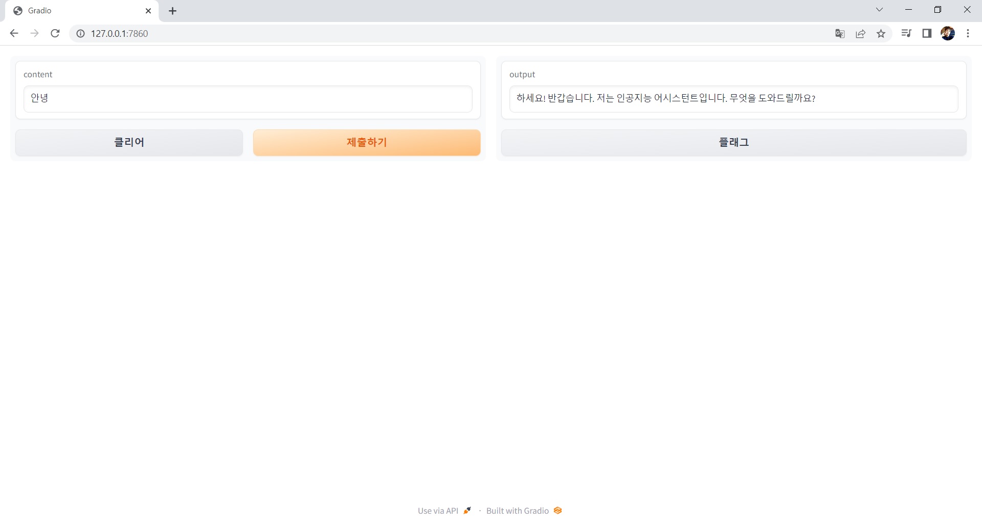 일단 gradio에서 메세지를 입력 후 '제출하기' 버튼을 클릭하면 greet() 함수를 호출한다.