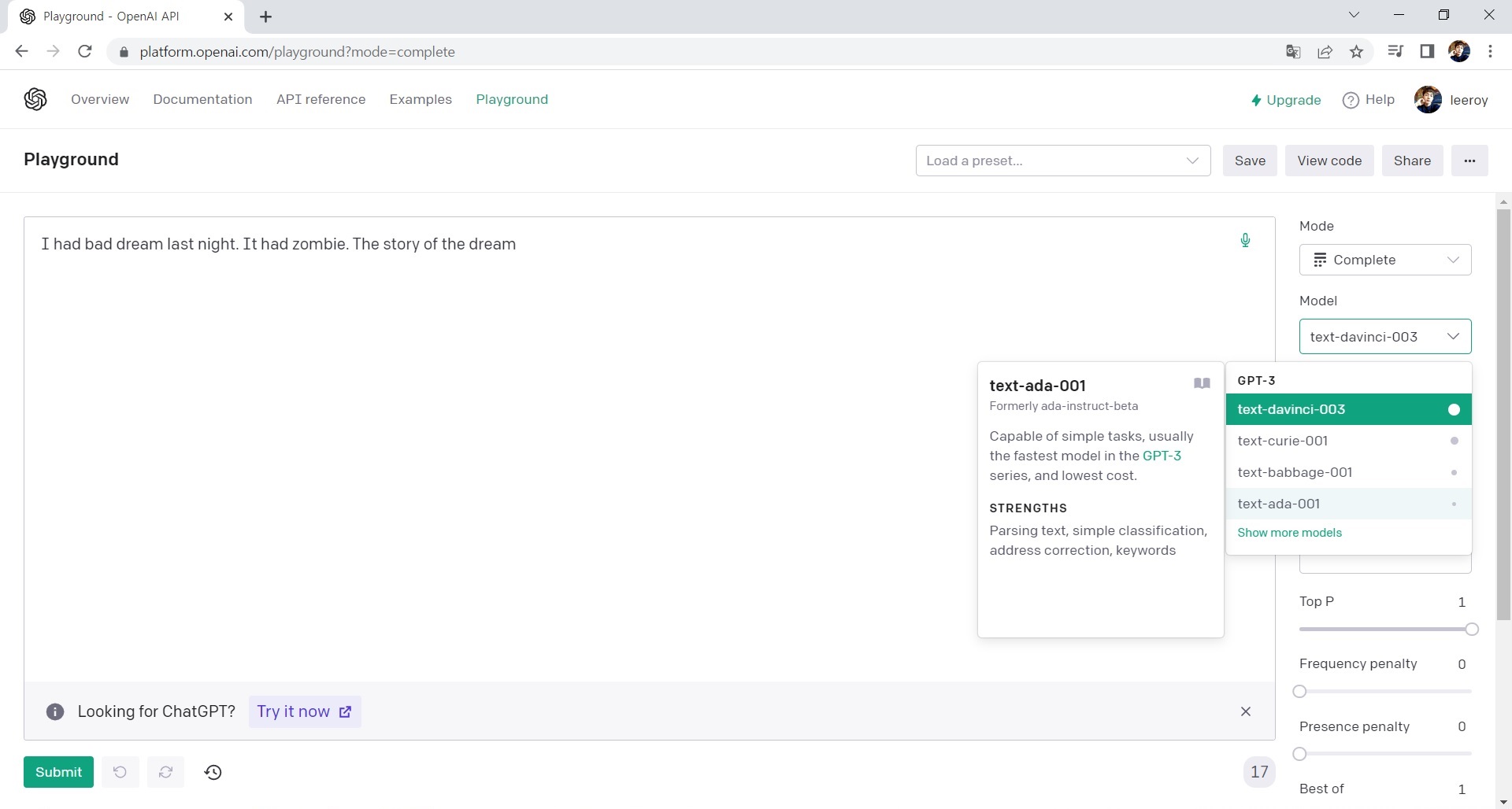 다음은 Model 선택인데 Model마다 특징이 있다. 가장 많이 사용하는 Model이 text-davinci-003이다.
