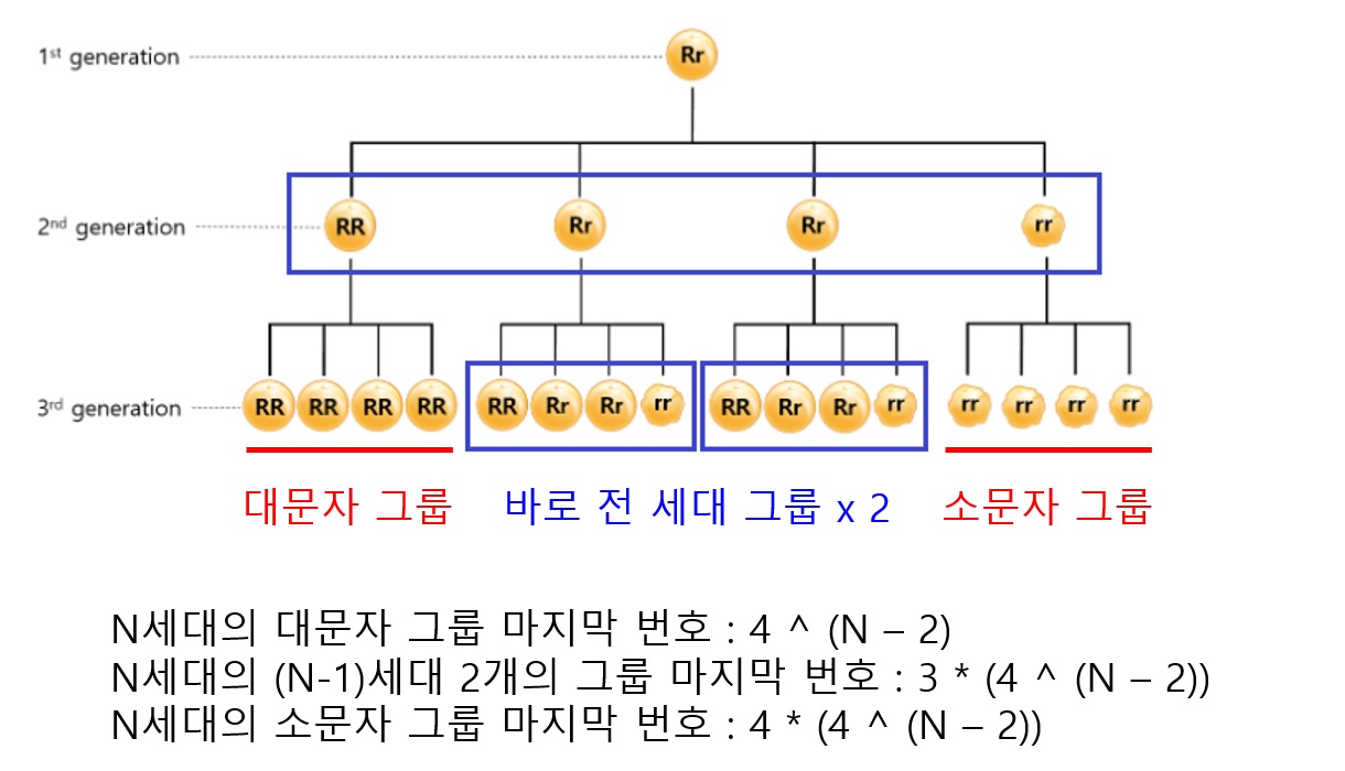 위 규칙을 이용해 내가 알고자 하는 형질의 세대와 번호를 전 세대로 가져가며 범위를 줄여가는 방식을 사용했다.