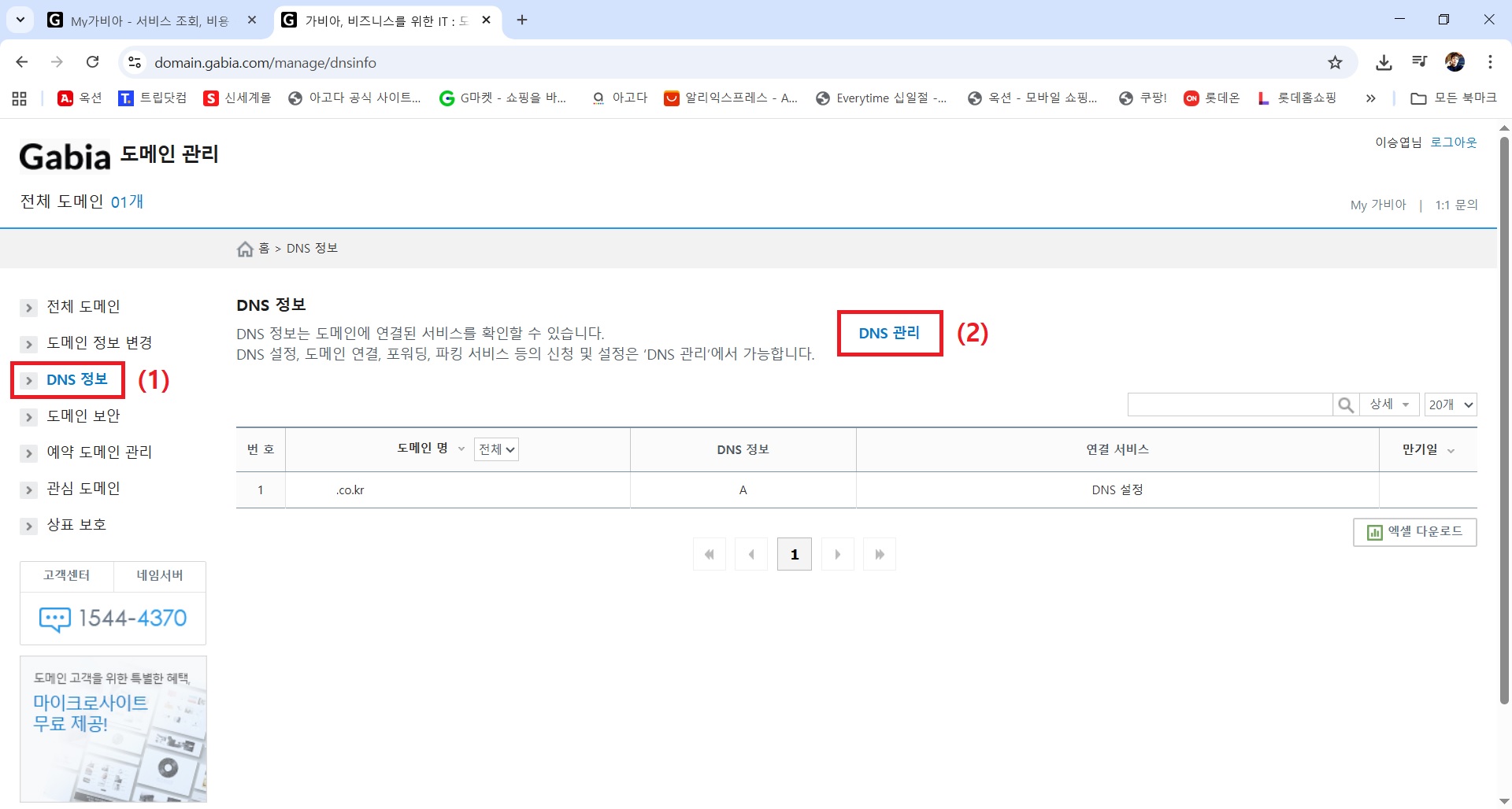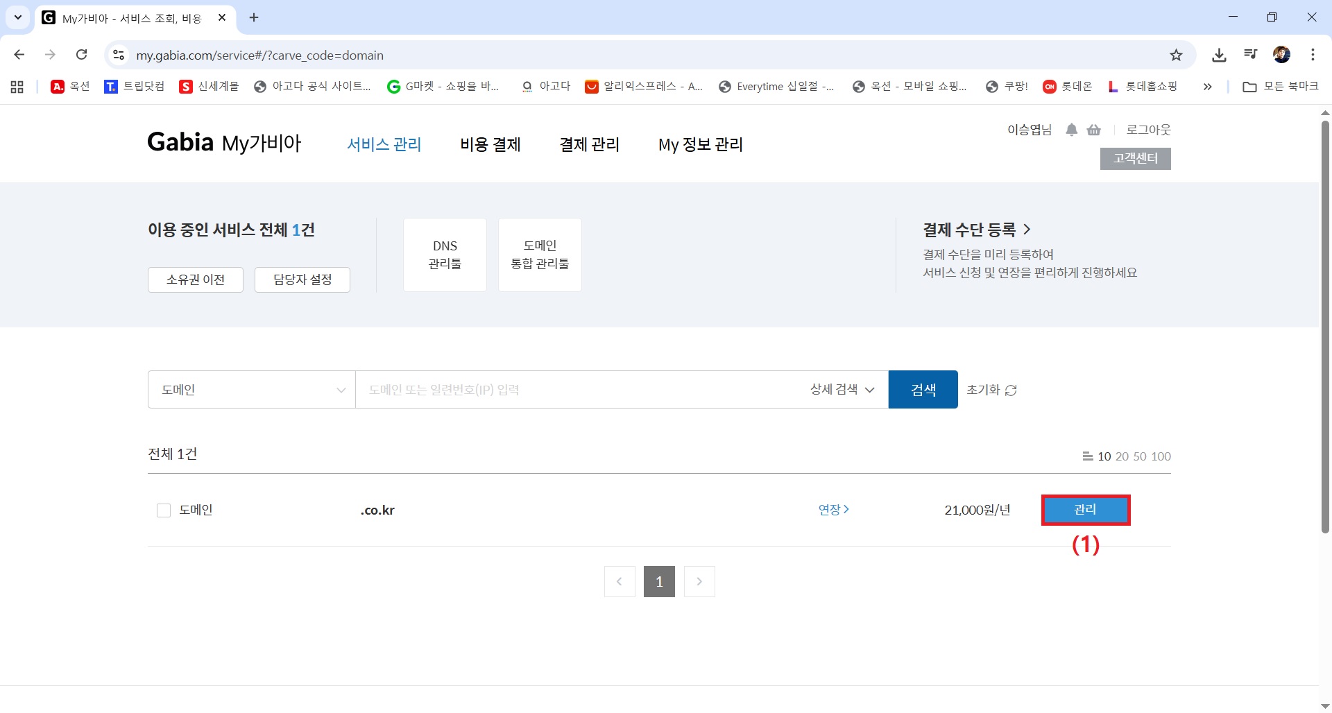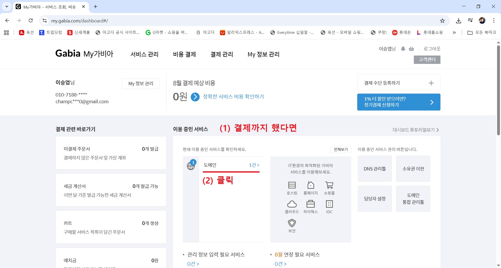 4) 결제 → My가비아 → 이용 중인 서비스에서 도메인 클릭