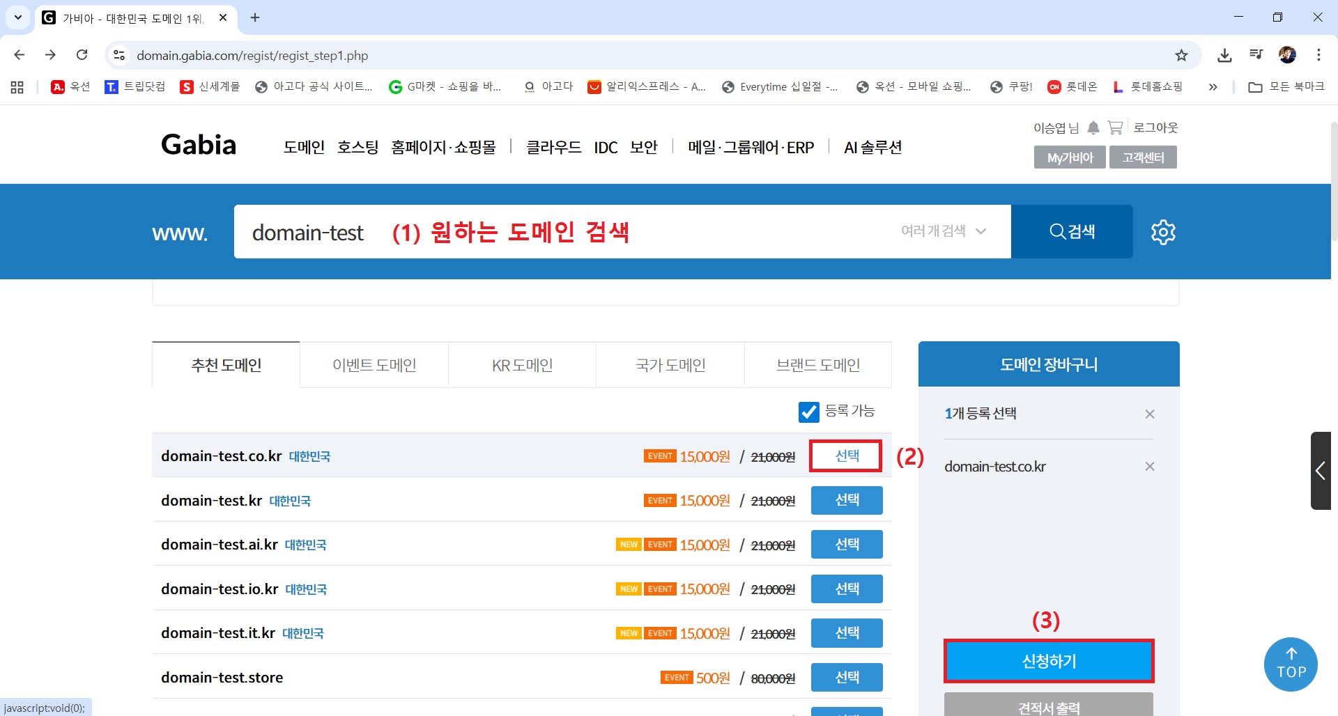 2) Gabia 홈페이지 접속 후 회원 가입 → 원하는 도메인 검색 → 도메인 선택 → 신청하기