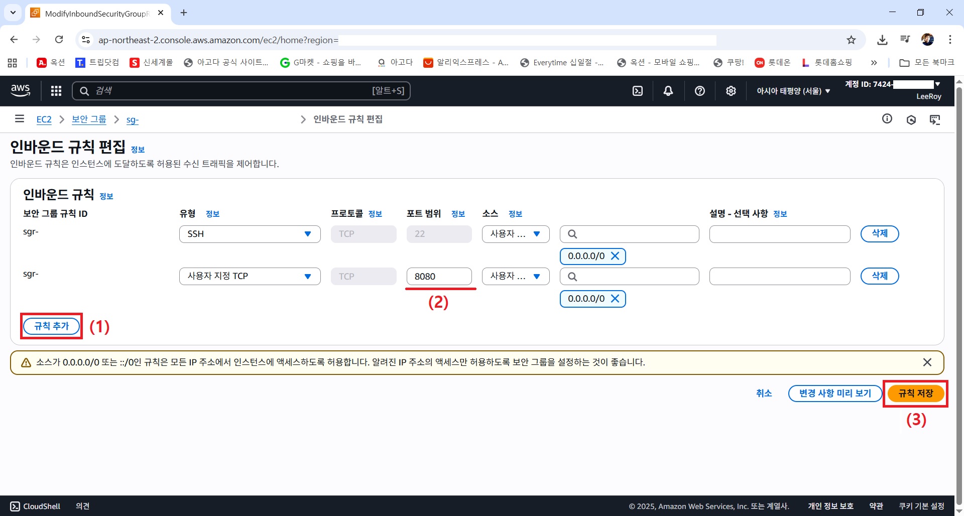 12) 규칙 추가 → 8080 포트 추가 → 액세스 허용할 IP 주소 입력(0.0.0.0/0은 모든 IP 주소에서 액세스 허용을 의미)