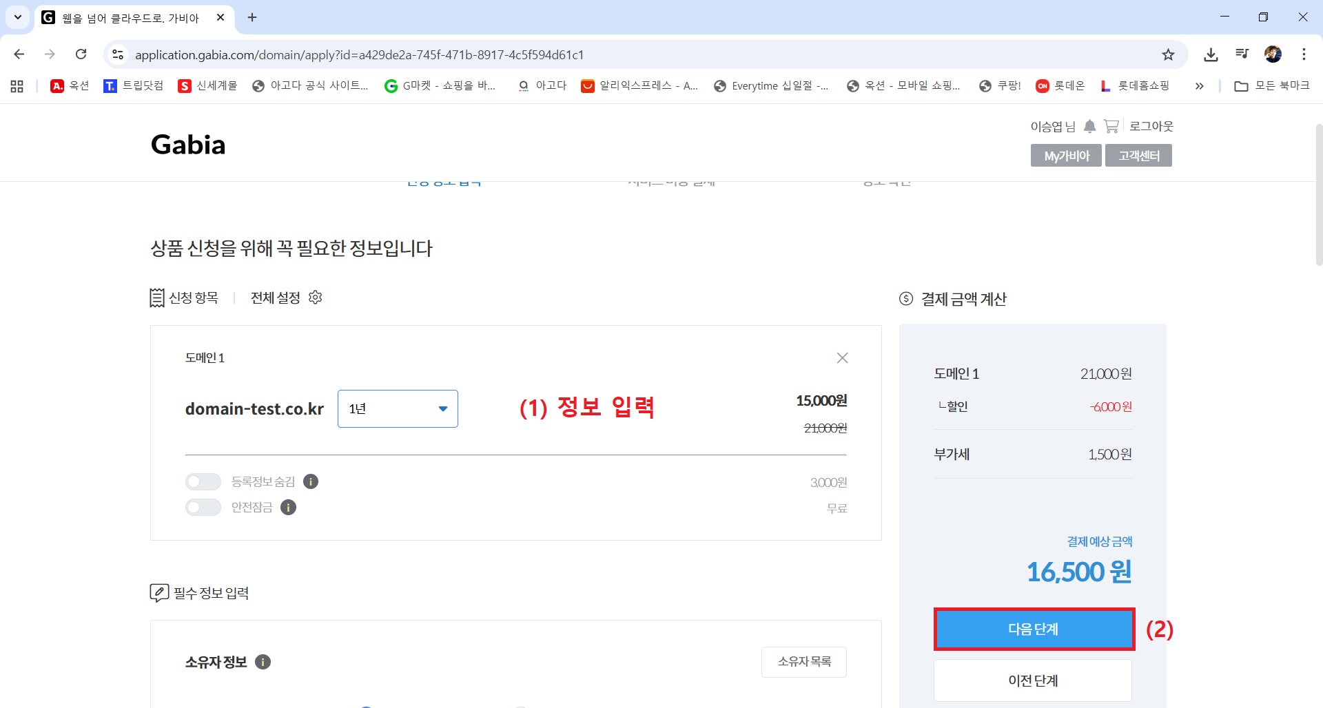 3) 도메인 신청을 위한 필수 정보 입력 → 다음단계