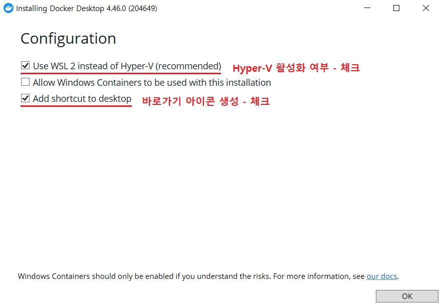 3) 다운로드 받은 Docker Desktop Installer 더블 클릭 → 체크 박스 유지 후 OK