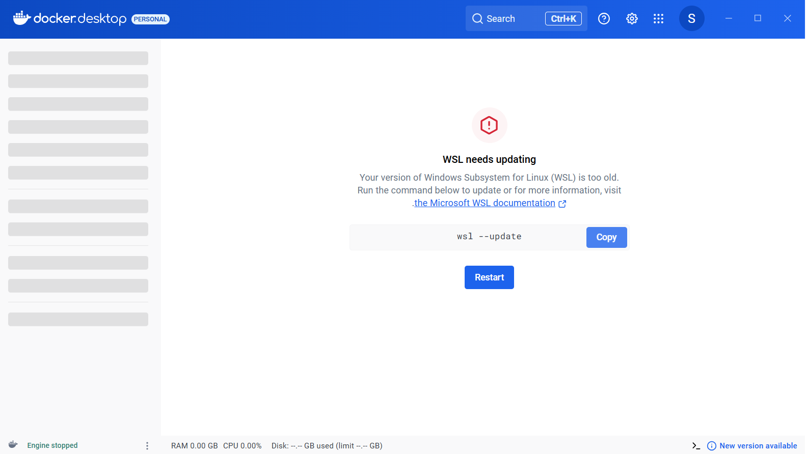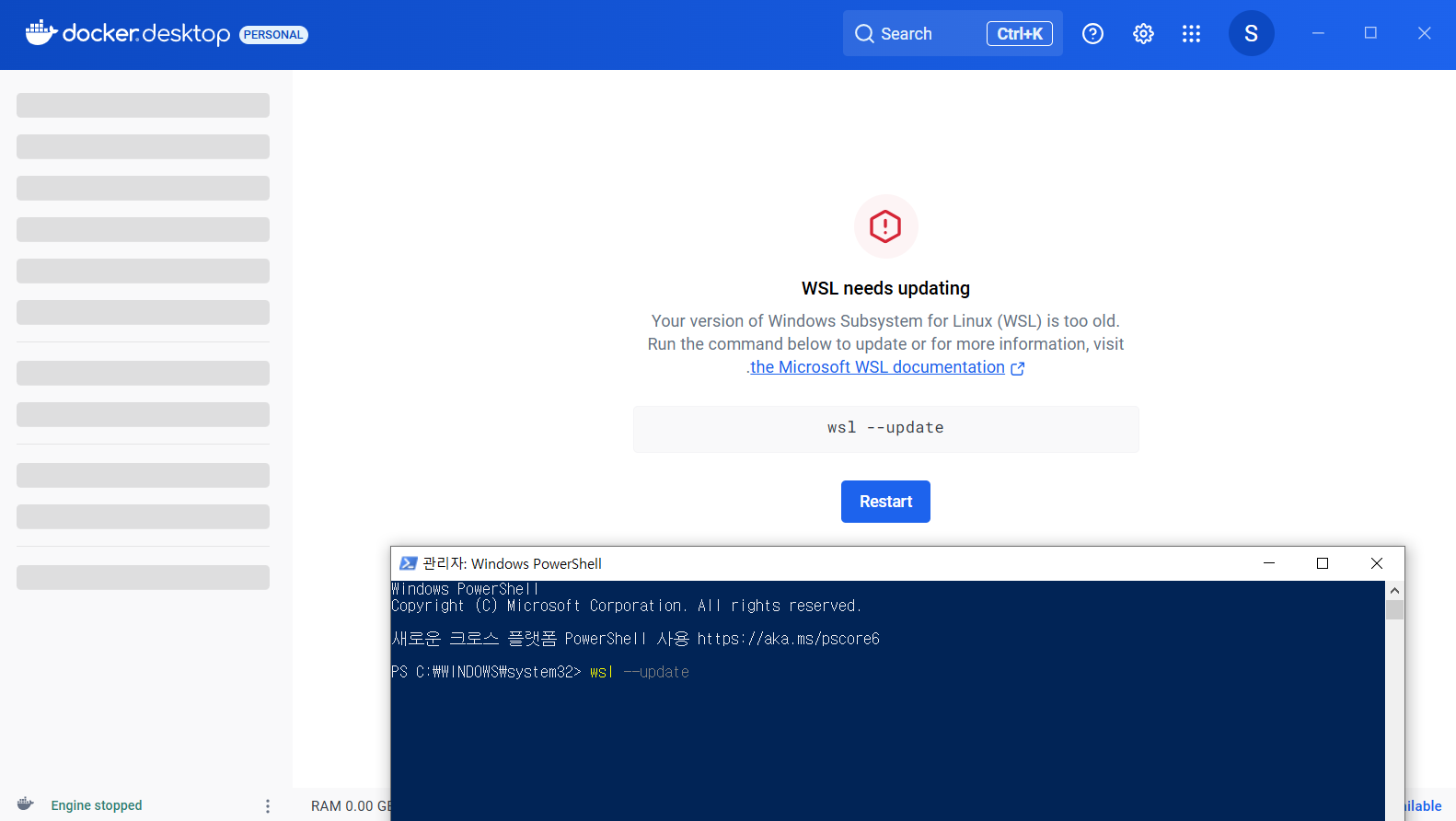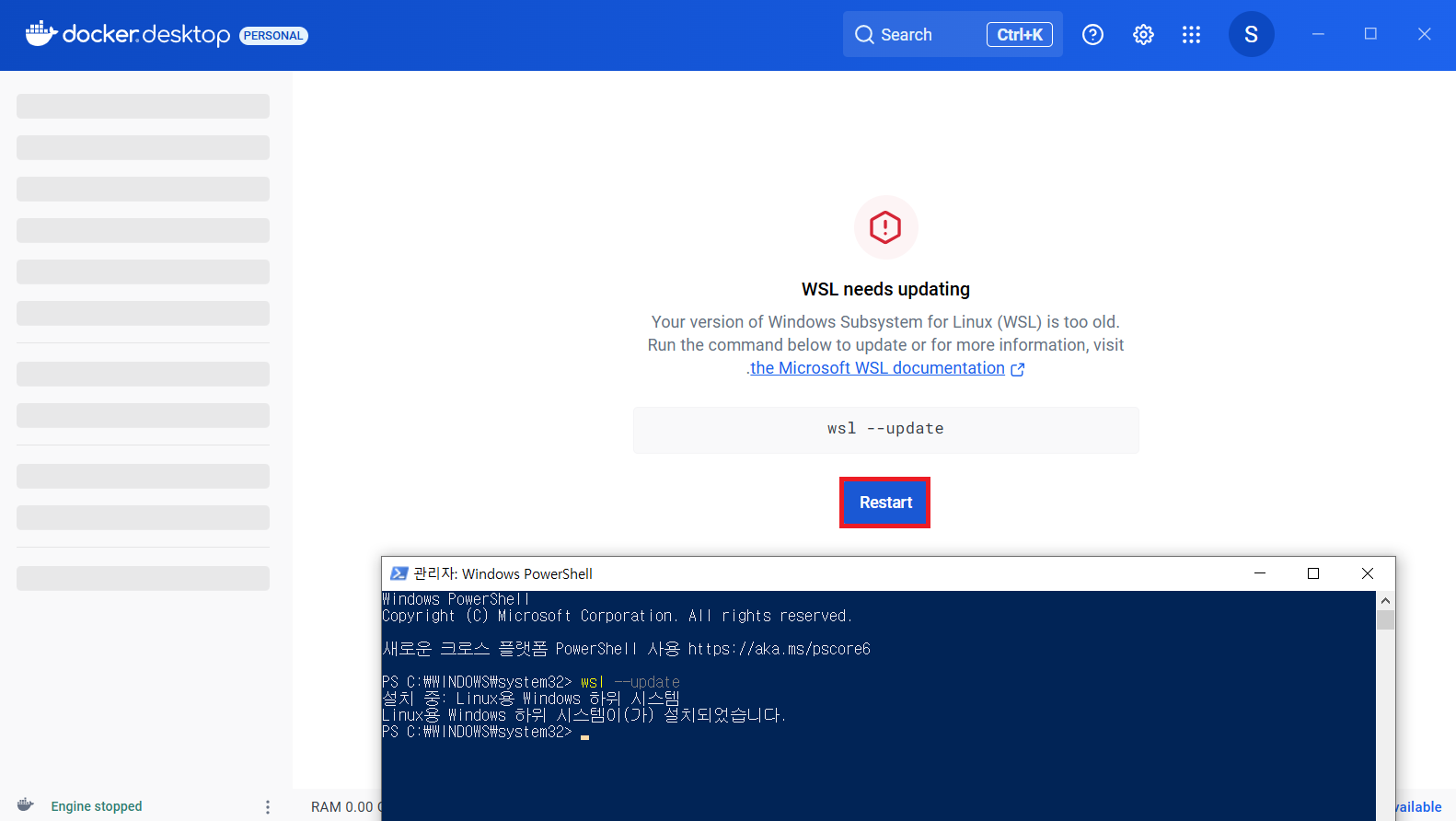 Docker Desktop은 최신 WSL2 기반에서 동작하기 때문에, Windows에 설치된 WSL 버전이 낮으면 업데이트가 필요