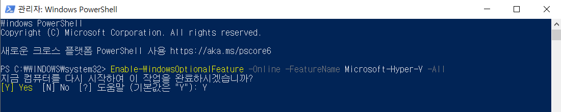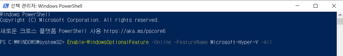 2) Enable-WindowsOptionalFeature -Online -FeatureName Microsoft-Hyper-V -All 입력 후 엔터