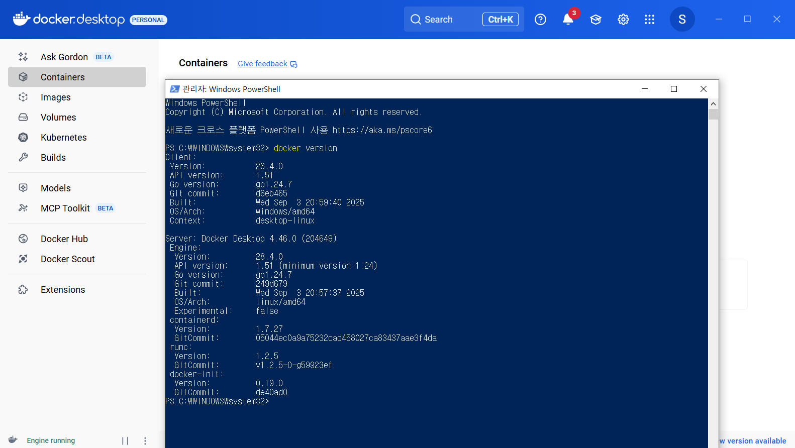 11) Windows PowerShell 관리자 권한으로 실행 후 docker version 입력 후 엔터 (버전 확인)