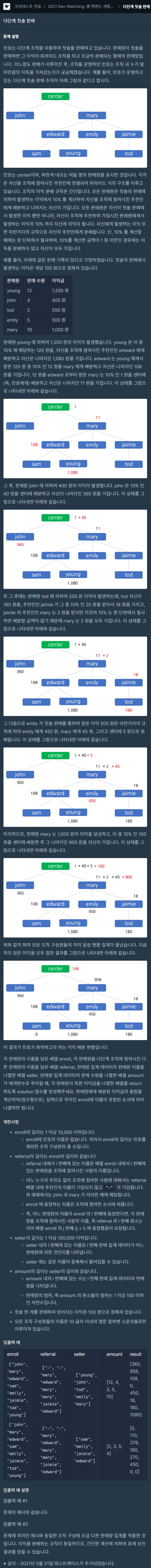 System.out.println(solution(enroll, referral, seller, amount)); // 360, 958, 108, 0, 450, 18, 180, 1080