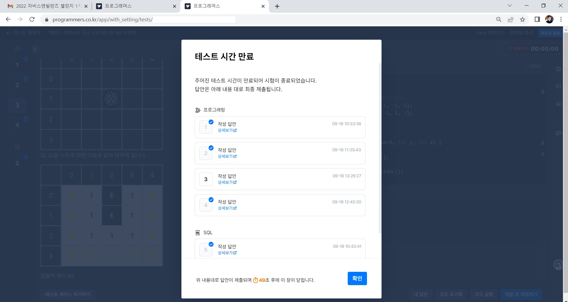 알고리즘 4문제, SQL 1문제, 제한 시간 210분