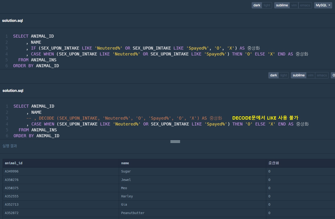 -- , DECODE (SEX_UPON_INTAKE, 'Neutered%', 'O', 'Spayed%', 'O', 'X') AS 중성화