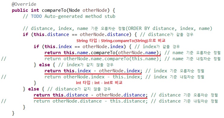// return this.getDistance() - otherNode.getDistance(); // distance 기준 오름차순 정렬 // 1, 2, 3, ...
