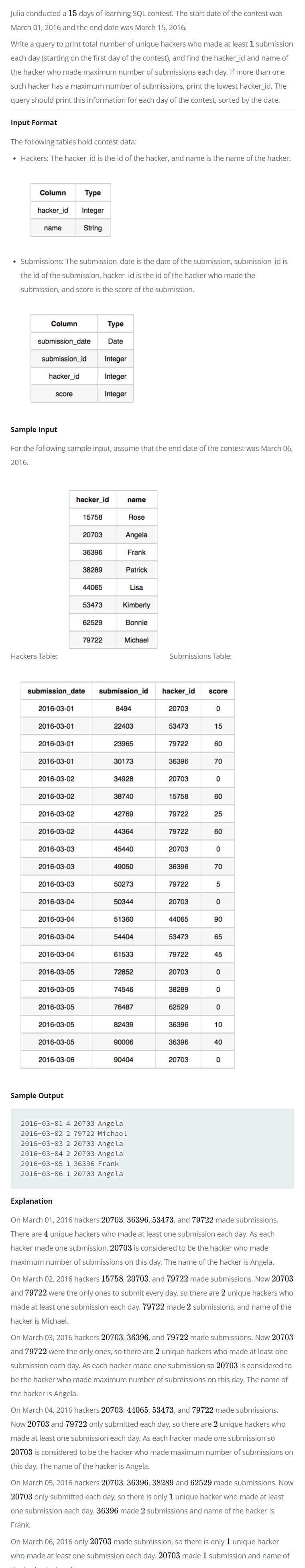 ORDER BY COUNT(SUBMISSION_ID) DESC, HACKER_ID LIMIT 1) AS ID