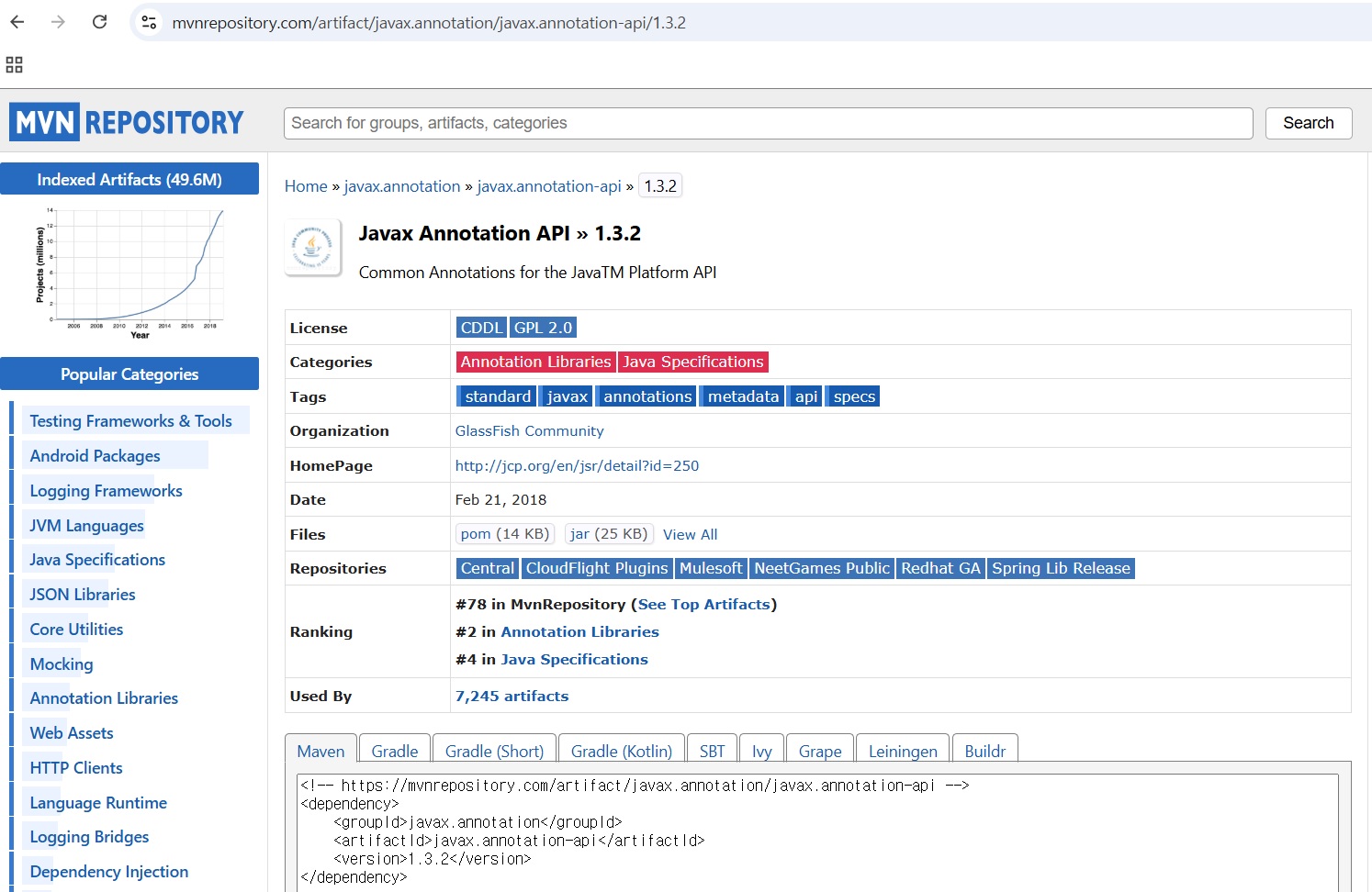 1. https://mvnrepository.com/artifact/javax.annotation/javax.annotation-api 접속 후 버전 선택