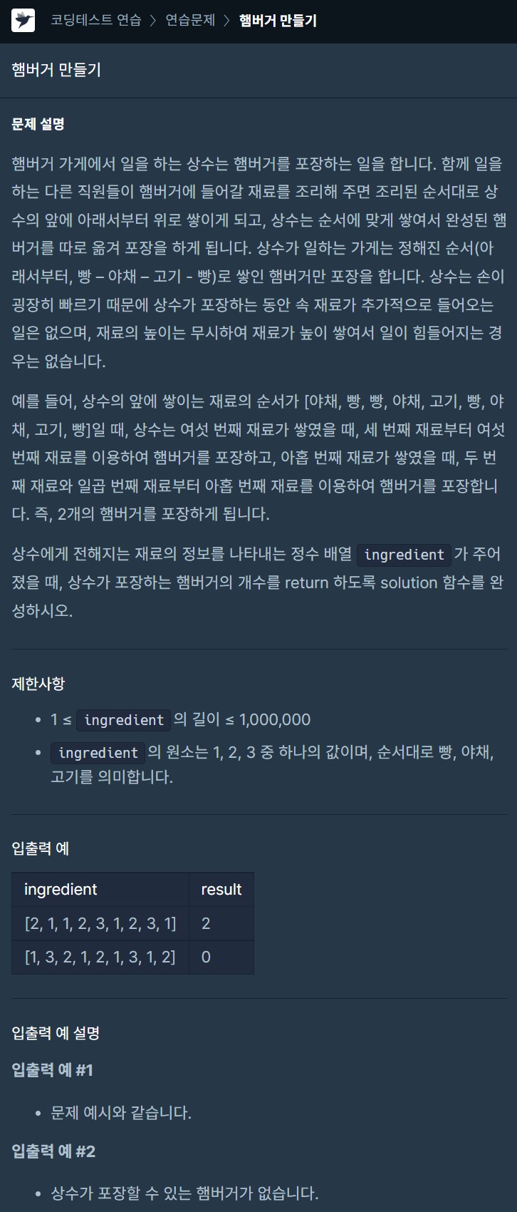 프로그래머스 햄버거 만들기 문제 풀이 Java